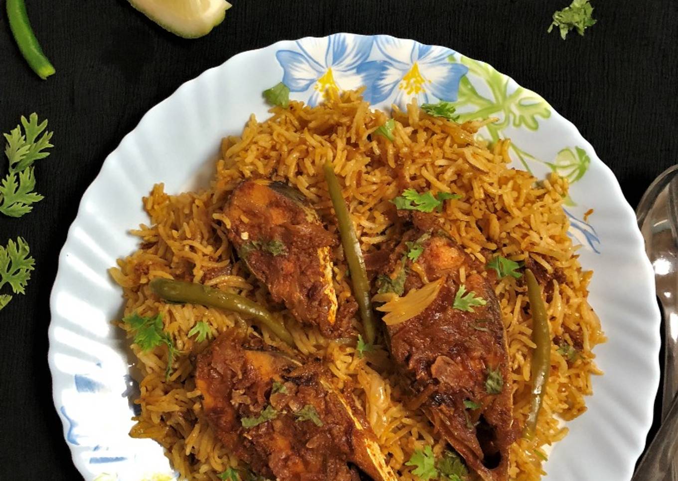 - Arrange the cooked rice in a pan and then arrange the cooked fish over it. Spread a little of the gravy, ghee, fried onions, green chilies, kewra water & coriander leaves.
