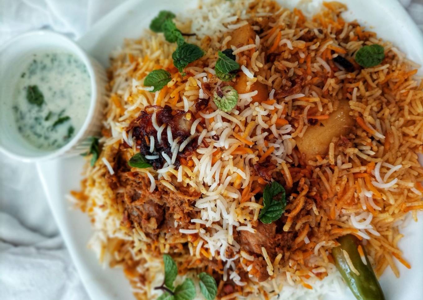 - On the top add brown onion zarda colour mint leaves coriander leaves chilli and now put it on dum(simmer)