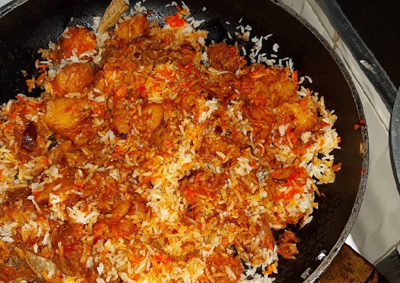 - In a pan,put little oil,let it heat,add some rice,then follow with biryani then rice on top.