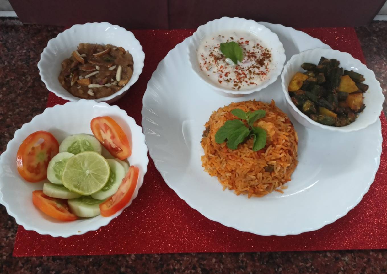 Dum Biryani, lady finger & potato, veg Rahita,wheat halwa & salad