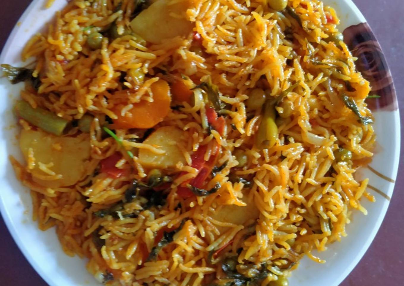 - Add mint leaves, coriander leaves, turmeric powder, chilli powder, garam masala, curd, salt and rice. cook on a medium flame for 4 whistles. Veg Biryani ready to be served.